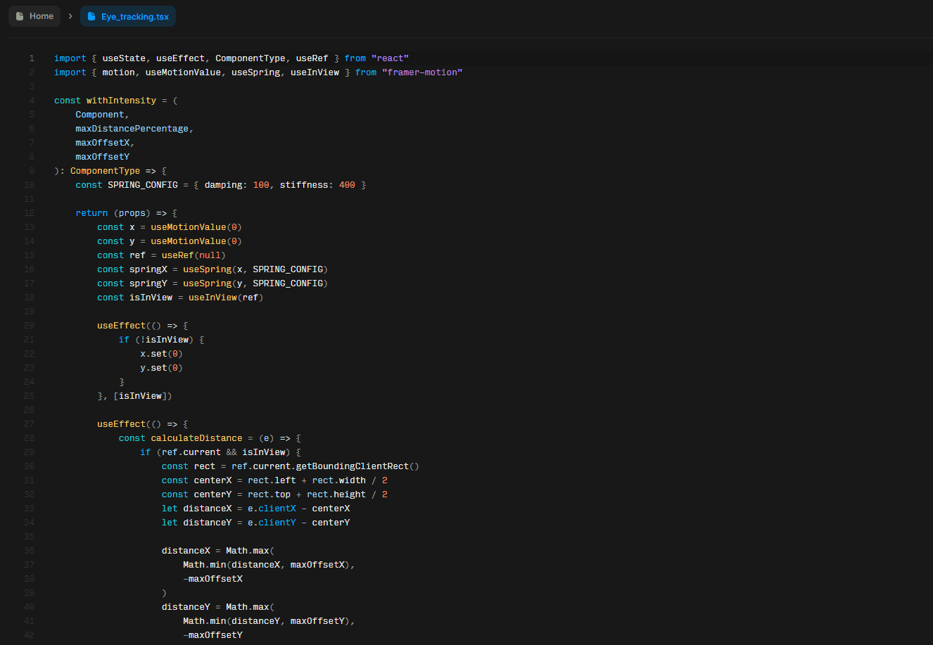 Hiệu ứng Eyes Tracking tạo ra sự tương tác thị giác trực tiếp và thu hút. Component sử dụng vị trí con trỏ chuột (Cursor Position) của người dùng làm tham số để điều khiển sự di chuyển của một hoặc nhiều thành phần trên màn hình (thường là "mắt" hoặc các đối tượng nhỏ).